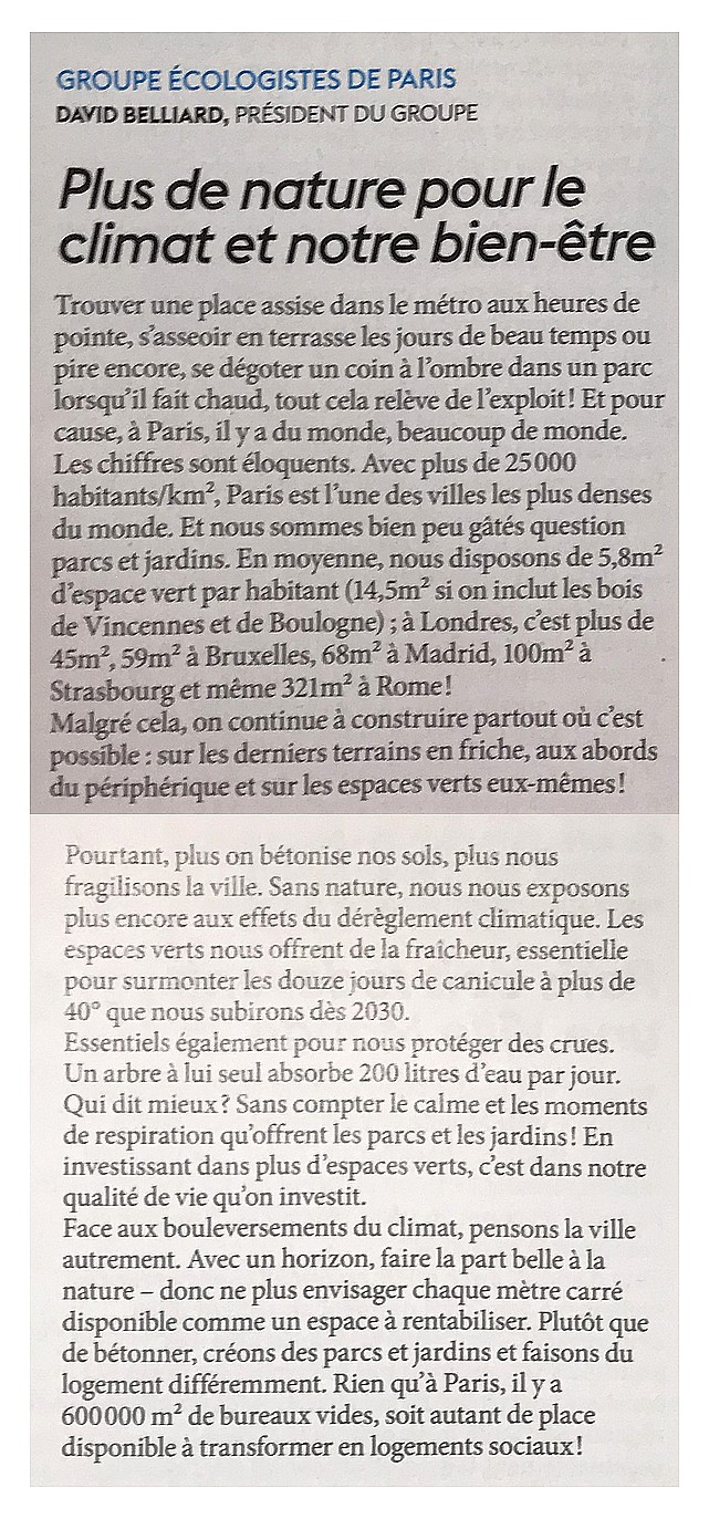 David BELLIARD, Président du Groupe Ecologistes de Paris : plus de nature pour le climat et notre bien-être par QSVP · 4 janvier 2019 Par David BELLIARD, Président du Groupe Ecologistes de Paris Article de David BELLIARD, Président du Groupe Ecologistes de Paris